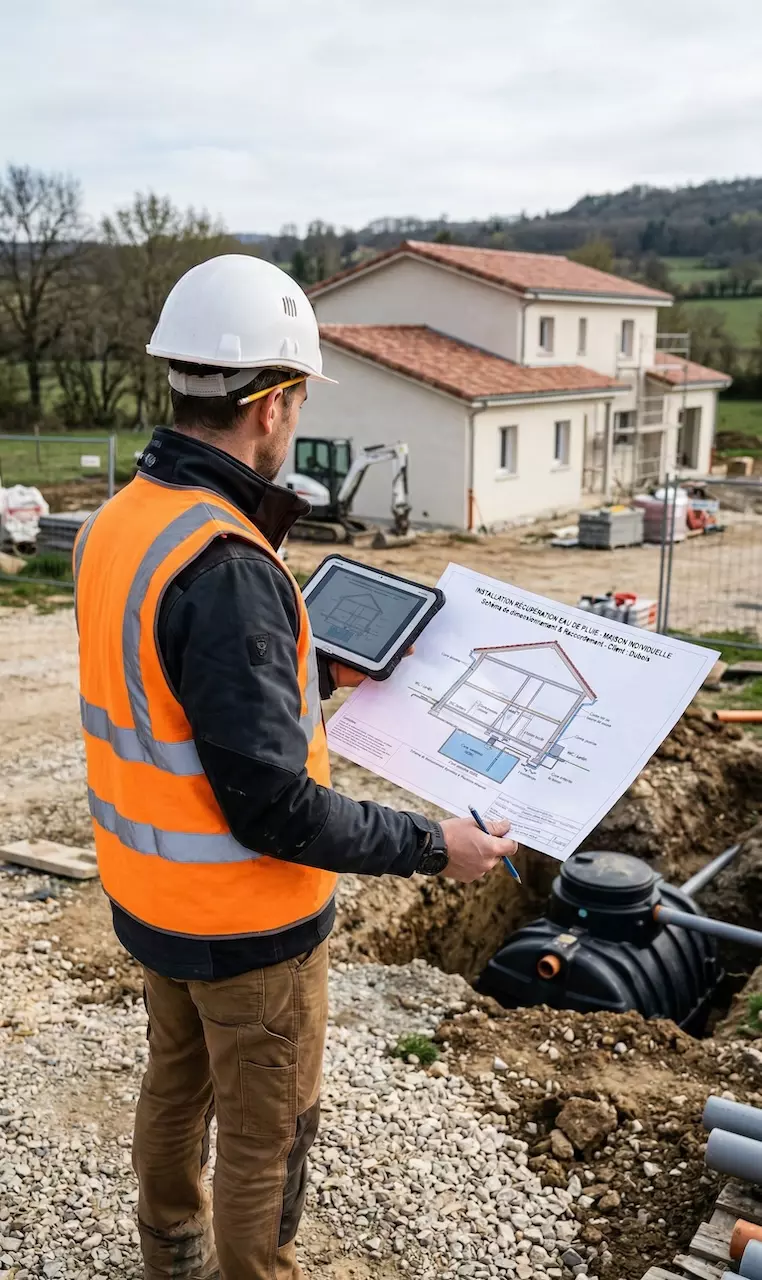 Installation de cuves béton ou polyéthylène enterrées de 3 000 à 10 000 litres. Nous assurons le terrassement, la pose, le raccordement aux descentes de gouttière et le remblaiement.